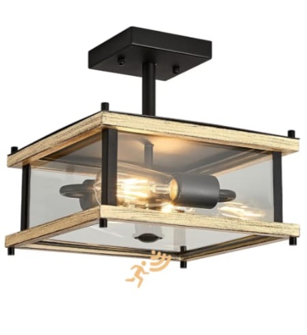 Upgrade your outdoor space with this Farmhouse Motion Sensor Outdoor Ceiling Light, designed to combine rustic charm with modern convenience. Featuring a square metal frame with a beautiful wood grain finish, this flush mount light brings a warm industrial farmhouse style to any exterior setting. The built-in motion sensor automatically turns the light on when movement is detected, providing added security and hands-free illumination for your porch, balcony, garage, hallway, or entryway. Crafted with durable metal and clear glass panels, it delivers bright, even lighting while protecting the bulb from outdoor elements. Its flush mount design is perfect for ceilings with limited space, making installation simple while maintaining a clean, stylish look. Whether you want to enhance your home’s curb appeal or improve nighttime visibility, this industrial outdoor ceiling fixture offers reliable performance, elegant design, and practical functionality for everyday use.